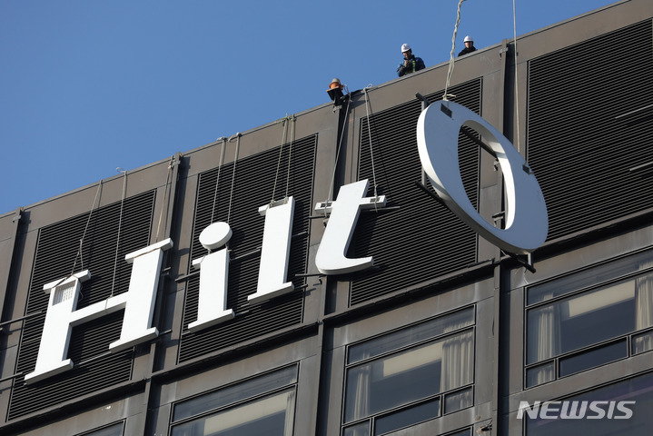 [서울=뉴시스] 조성우 기자 = 1일 오전 지난해 연말자로 영업을 종료한 서울 중구 밀레니엄 힐튼 서울 호텔에서 관계자들이 간판 철거 작업을 하고 있다. 2023.01.01. [email protected]
