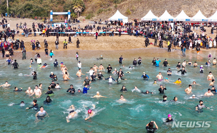 [서귀포=뉴시스] 우장호 기자 = 계묘년(癸卯年) 새해 첫날인 1일 오전 제주 서귀포시 중문색달해수욕장에서 제24회 국제펭귄수영대회 참가자들이 차가운 바닷물에 뛰어 들며 희망찬 2023년을 맞이하고 있다. 2023.01.01. [email protected]