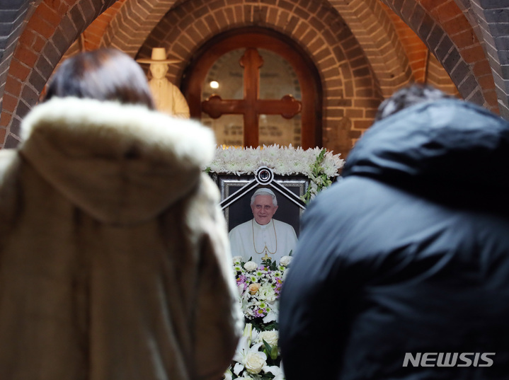 [서울=뉴시스] 김진아 기자 = 1일 오후 명동대성당 지하에 마련된 베네딕토 16세 전 교황의 분향소를 찾은 시민들이 조문하고 있다. 2023.01.01. [email protected]