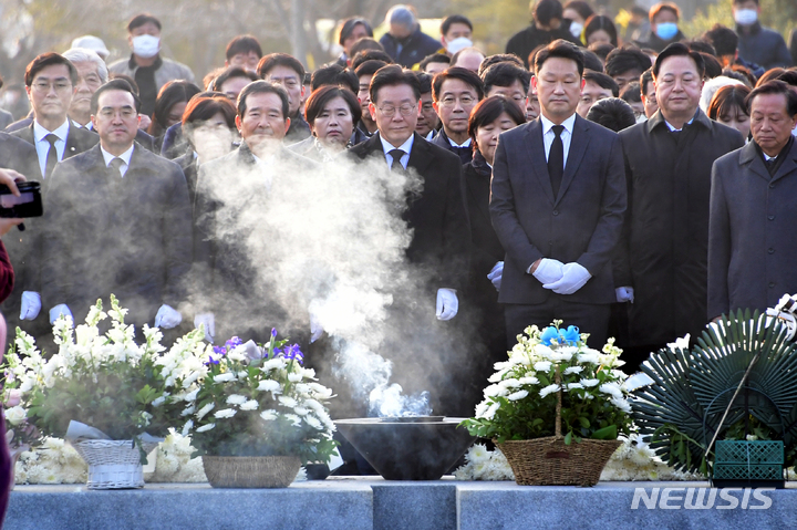 [김해=뉴시스] 차용현 기자 = 1일 오후 더불어민주당 이재명 대표가 당 지도부와 함께 경남 김해시 진영읍 봉하마을 故 노무현 전 대통령 묘역을 참배하고 있다. 2023.01.01. [email protected]