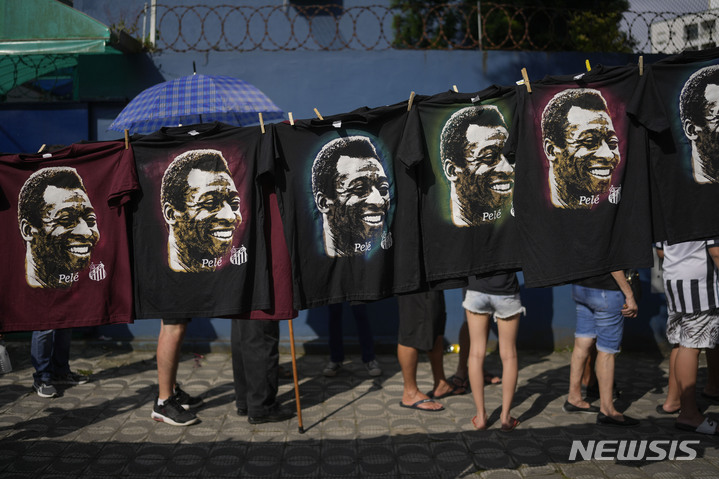 [산투스=AP/뉴시스] 2일(현지시간) 브라질 상파울루 외곽 산투스의 빌라 베우미루 경기장 부근에서 '축구황제' 펠레의 조문객들이 기다리는 동안 그의 얼굴이 담긴 티셔츠가 판매되고 있다. 이날 펠레의 장례 절차가 시작돼 펠레는 팬들과 작별 후 산투스 시내를 통하는 노제를 거쳐 메모리얼 네크로폴 묘지에서 영면에 든다. 2023.01.03.