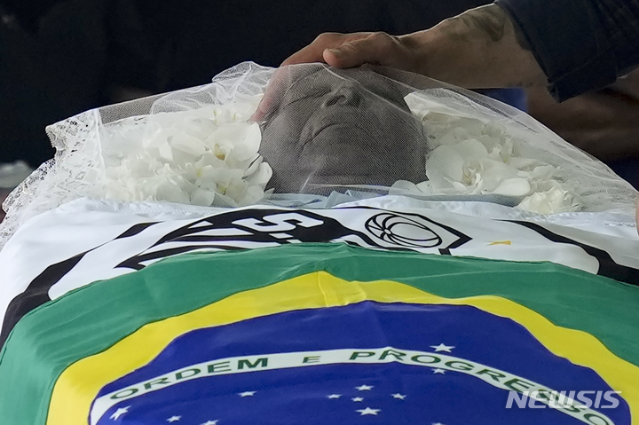 [산투스=AP/뉴시스] 2일(현지시간) 브라질 상파울루 외곽 산투스의 빌라 베우미루 경기장에서 '축구황제' 펠레의 아들 에디뉴가 이곳에 안치된 펠레의 이마를 어루만지고 있다. 이날 펠레의 장례 절차가 시작돼 펠레는 팬들과 작별 후 산투스 시내를 통하는 노제를 거쳐 메모리얼 네크로폴 묘지에서 영면에 든다. 2023.01.03.