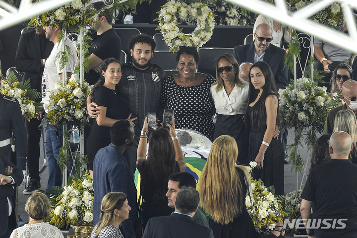 [산투스=AP/뉴시스] 2일(현지시간) 브라질 상파울루 외곽 산투스의 빌라 베우미루 경기장에서 '축구황제' 펠레의 딸 켈리 나시멘투(가운데)와 프라비아(오른쪽 두 번째)가 자녀들과 함께 이곳에 안치된 펠레 시신 앞에서 사진을 찍고 있다. 이날 펠레의 장례 절차가 시작돼 펠레는 팬들과 작별 후 산투스 시내를 통하는 노제를 거쳐 메모리얼 네크로폴 묘지에서 영면에 든다. 2023.01.03.