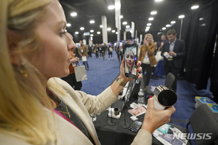 [라스베이거스=AP/뉴시스] 3일(현지시간) 미 네바다주 라스베이거스에서 열리는 세계 최대 가전·IT 전시회 'CES 2023'을 앞두고 사전 공개행사가 열려 한 전시업체 직원이 증강현실을 사용해 눈썹 문신하는 것을 돕는 '로레알 브로우 매직' 앱을 시연하고 있다. 브로우 매직은 사용자에게 가장 알맞은 눈썹 모양과 마이크로 블레이딩, 마이크로 셰이딩 등 문신 기법을 추천해준다. 2023.01.04.