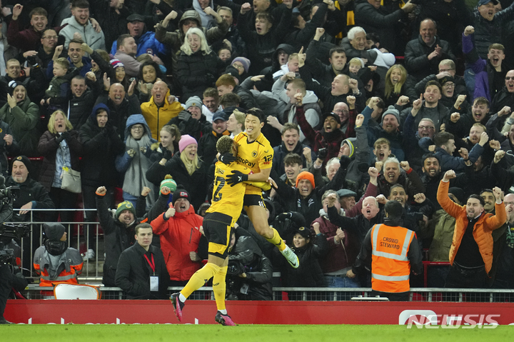 [리버풀=AP/뉴시스] 울버햄프턴의 황희찬(오른쪽)이 7일(현지시간) 영국 리버풀의 안필드에서 열린 2022-23 잉글랜드축구협회(FA)컵 3라운드(64강전) 리버풀과의 경기 후반 21분 동점 골을 터트린 후 기뻐하고 있다. 황희찬은 이번 시즌 첫 골을 기록했고 팀은 2-2로 비겼다. 2023.01.08.