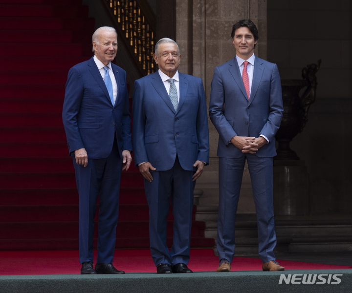 [멕시코시티=AP/뉴시스] 조 바이든 대통령, 안드레스 마누엘 로페스 오브라도르 멕시코 대통령, 쥐스탱 트뤼도 캐나다 총리(왼쪽부터)가 10일(현지시간) 멕시코시티 국립궁전에서 제10차 북미3국 정상회담 전 기념 촬영을 하고 있다. 2023.01.11.