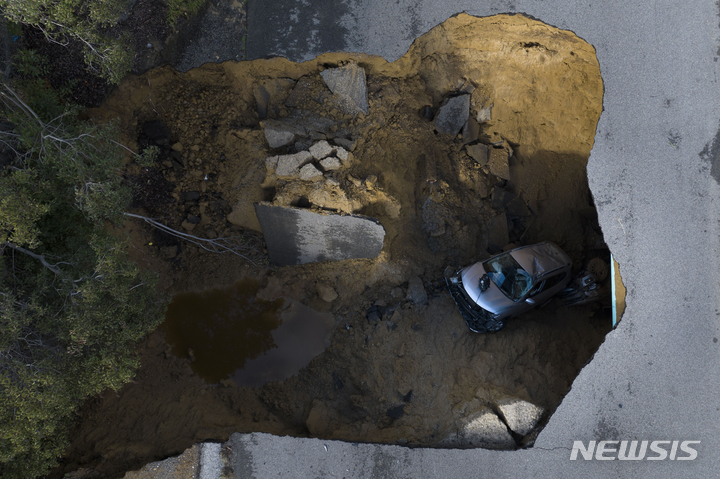 캘리포니아 폭풍우로 싱크홀에 빠진 자동차