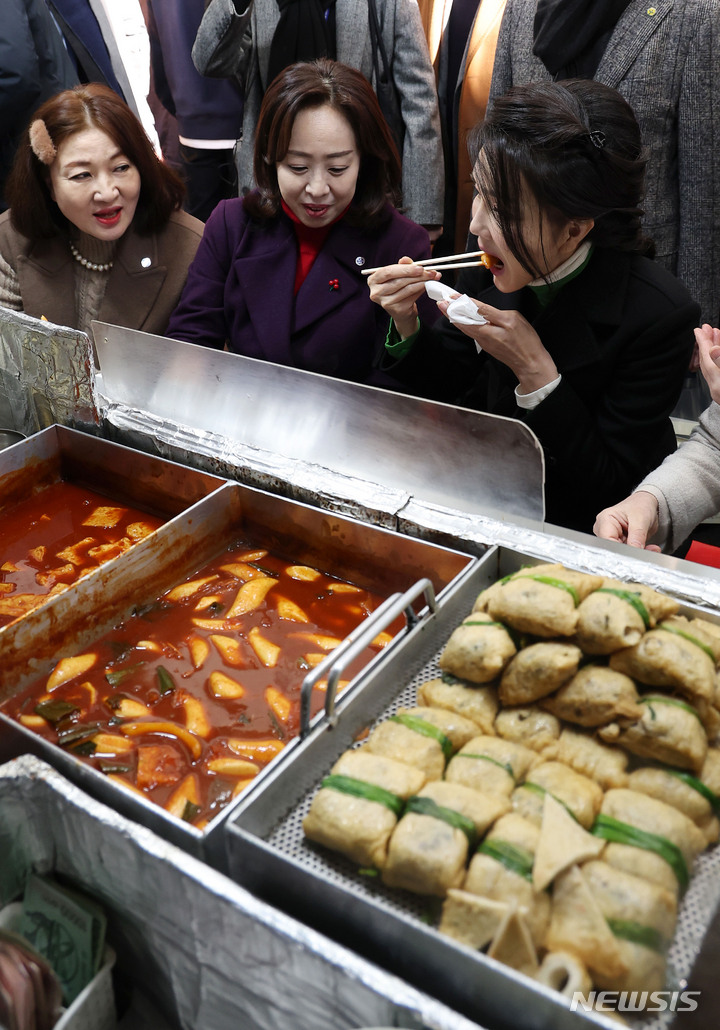 [대구=뉴시스] 홍효식 기자 = 윤석열 대통령 부인 김건희 여사가 11일 대구 서문시장을 찾아 떡볶이를 시식하고 있다. (대통령실통신사진기자단) 2023.01.11. [email protected]