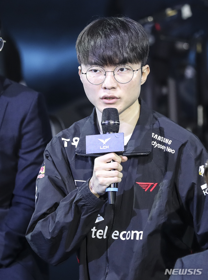 [서울=뉴시스] 김근수 기자 = '페이커' 이상혁 선수가 12일 서울 종로구 LCK 아레나에서 '2023 리그오브레전드 챔피언십 코리아(LCK) 스프링 시즌 미디어 데이'에서 각오를 밝히고 있다. 2023.01.12. [email protected]