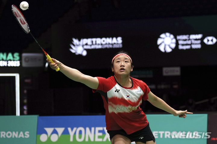 [쿠알라룸푸르=AP/뉴시스] 안세영이 13일(현지시간) 말레이시아 쿠알라룸푸르의 악시아타 아레나에서 열린 2023 말레이시아오픈 배드민턴선수권대회(월드투어 슈퍼 1000) 여자 단식 8강전에서 왕즈이(중국)와 경기하고 있다. 안세영이 세트 스코어 2-1(21-17 16-21 21-19)로 승리하고 4강에 올랐다. 2023.01.13.