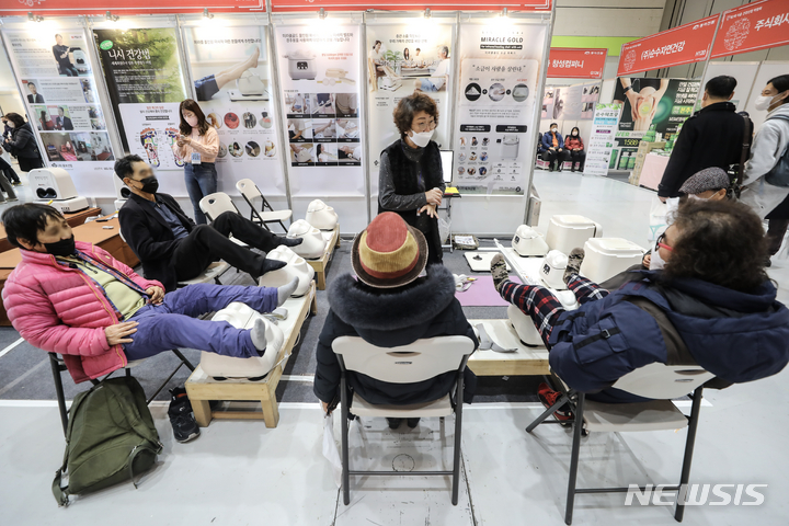 [서울=뉴시스] 김근수 기자 = 13일 서울 강남구 코엑스에서 열린 '제7회 서울 건강산업박람회'에서 관람객들이 의료기기를 체험하고 있다. 2023.01.13. [email protected]