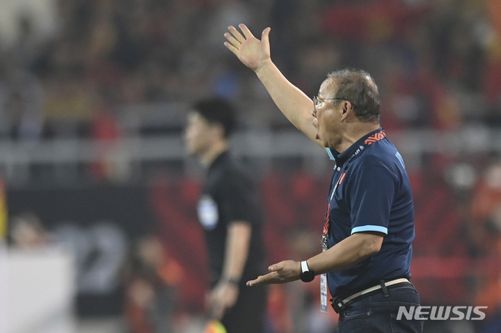 [하노이=AP/뉴시스] 베트남 축구대표팀의 박항서 감독이 13일(현지시간) 베트남 하노이의 미딘 국립경기장에서 열린 아시아축구연맹(AFF) 미쓰비시컵 결승 1차전 태국과의 홈경기 중 작전 지시를 하고 있다. 베트남은 태국과 2-2 무승부를 기록해 16일 태국에서 열리는 결승 2차전에서 이기거나 2골 이상 넣고 비겨야 우승할 수 있다. 2023.01.14.