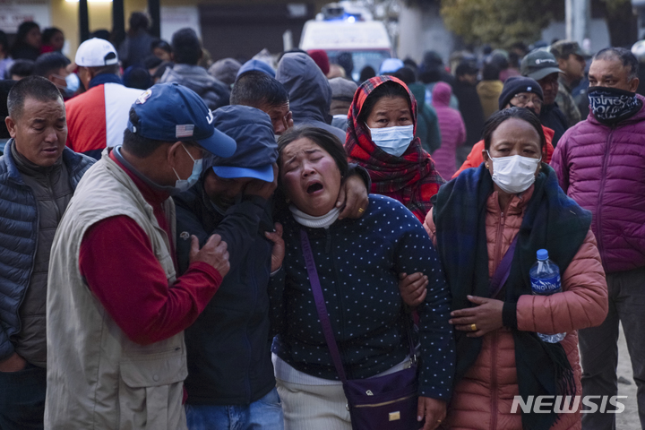 [포카라=AP/뉴시스] 15일(현지시간) 네팔 포카라에서 한 여성이 비행기 추락 희생자의 시신이 병원으로 이송되는 걸 보면서 흐느끼고 있다. 72명을 태운 네팔 예티항공 소속 ATR72기가 카트만두를 출발해 포카라 공항으로 향하던 중 공항 인근 협곡에서 추락해 최소 68명이 숨졌다. 2023.01.16.