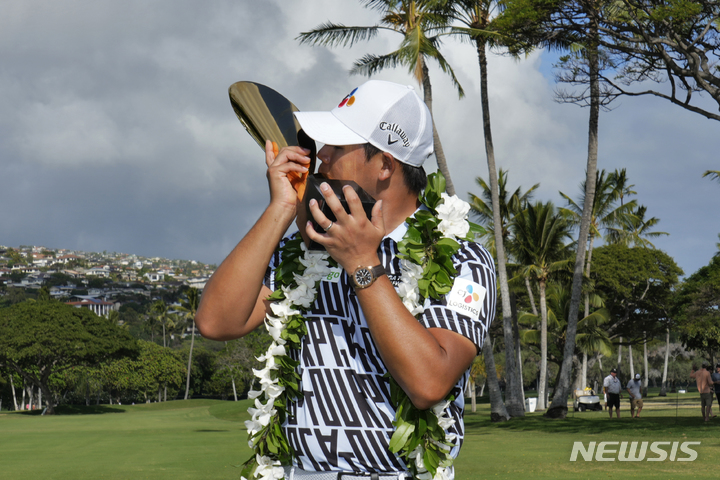 [호놀룰루=AP/뉴시스] 김시우가 15일(현지시간) 미 하와이주 호놀룰루의 와이알레이 컨트리클럽에서 열린 미국프로골프(PGA) 투어 소니 오픈 정상에 올라 트로피를 들고 입 맞추고 있다. 김시우는 최종 합계 18언더파 262타로 정상에 올라 결혼 후 첫 승, PGA 통산 4승을 달성했다. 2023.01.16.