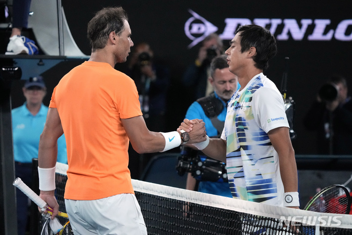 [멜버른=AP/뉴시스] 라파엘 나달(2위·스페인)이 18일(현지시간) 호주 멜버른의 로드 레이버 아레나에서 열린 2023 호주 오픈 남자 단식 2회전에서 매켄지 맥도널드(65위·미국)에게 패한 후 인사를 나누고 있다. 디펜딩 챔피언 나달은 맥도널드에게 세트 스코어 0-3(4-6 4-6 5-7)로 패해 조기 탈락했다. 나달은 2세트 중반부터 부상으로 정상적인 경기를 펼치지 못하고 패하며 탈락했다. 2023.01.18.
