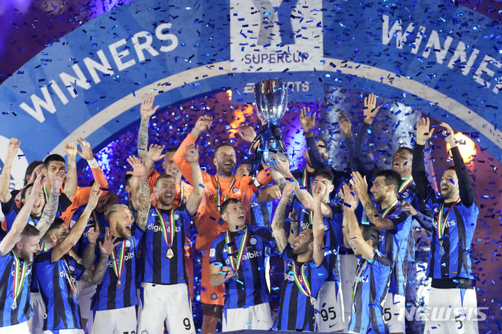 [리야드=AP/뉴시스] 인테르 밀란 선수들이 18일(한국시간) 사우디아라비아 리야드의 킹 사우드 유니버시티 스타디움에서 열린 2022~23시즌 수페르코파 이탈리아나(이탈리아 슈퍼컵) 정상에 올라 트로피를 들고 환호하고 있다. 인테르 밀란은 결승전에서 AC 밀란을 3-0으로 꺾고 대회 7번째 우승을 차지했다. 2023.01.19.