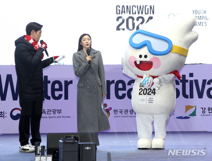 [평창=뉴시스] 김경목 기자 = 19일 오후 강원도 평창 용평리조트 야외무대에서 '2023 강원 동계청소년올림픽대회' 개최 1년(G-1)을 맞아 마스코트 뭉초, 주제가  We go high, 안무 등 상징물을 공개하는 행사가 열렸다. 김연아 홍보대사가 인사말을 하고 있다. 2024 강원 동계청소년올림픽대회 조직위원회는 이번 행사를 통해 강원 2024의 비전인 '즐거움과 성장이 되는 스포츠, 공존과 화합으로 여는 평화로운 미래'라는 메시지를 전했다.