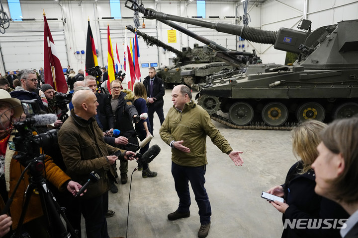 [타파=AP/뉴시스] 벤 월러스(가운데) 영국 국방장관이 19일(현지시간) 에스토니아의 타파 군기지를 방문해 취재진에 발언하고 있다. 월러스 장관은 챌린저2 전차 14대, AS90 자주포 9문, 장갑차 수백 대, 포탄 약 10만 발, 브림스톤 미사일 등을 우크라이나에 지원할 것이라고 밝혔다. 2023.01.20.