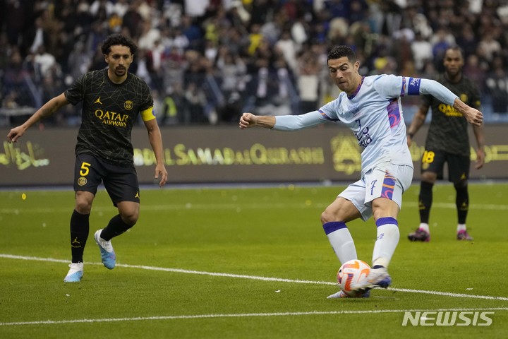 [리야드=AP/뉴시스] 크리스티아누 호날두(알나스르)가 19일(현지시간) 사우디아라비아 리야드의 킹 파흐드 국립경기장에서 열린 알나스르-알힐랄 사우디 연합팀과 파리 생제르맹(PSG)과의 친선 경기 전반 추가시간 팀의 두 번째 골을 넣고 있다. 이날 호날두의 멀티 골과 메시, 장현수 등의 골 잔치가 펼쳐지며 경기는 PSG의 5-4 승리로 끝났다. 2023.01.20.