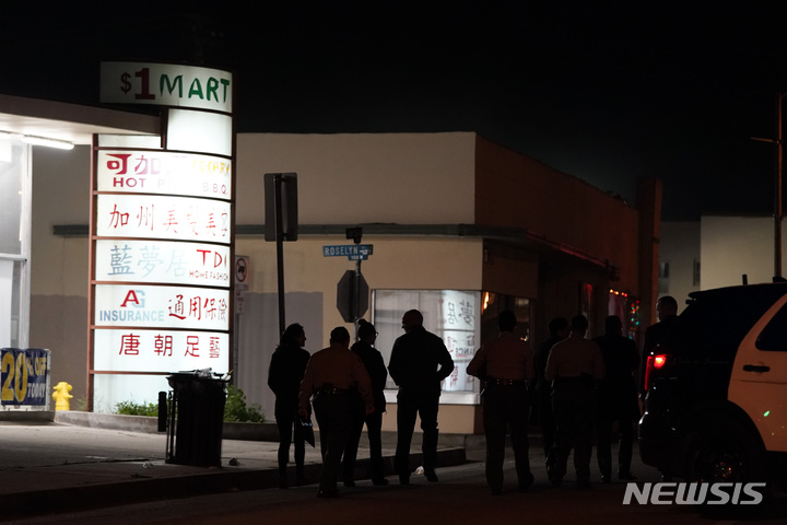 [몬터레이파크=AP/뉴시스] 22일(현지시간) 경찰 관계자들이 전날 미국 캘리포니아 몬터레이파크에서 발생한 총격 사건 관련 브리핑을 한 후 사건 현장으로 가고 있다. 2023.01.22.