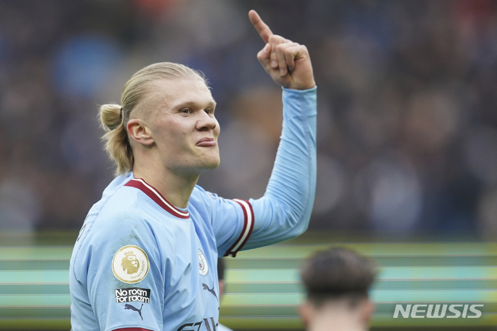 [맨체스터=AP/뉴시스] 맨체스터 시티의 엘링 홀란이 22일(현지시간) 영국 맨체스터의 에티하드 스타디움에서 열린 2022-23시즌 잉글랜드 프리미어리그(EPL) 21라운드 울버햄프턴 울브스와의 경기 전반 40분 선제골을 넣고 기뻐하고 있다. 홀란은 시즌 4번째 해트트릭을 달성, 시즌 25골로 득점 1위를 질주했으며 맨시티는 울버햄프턴을 3-0으로 완파했다. 2023.01.23.