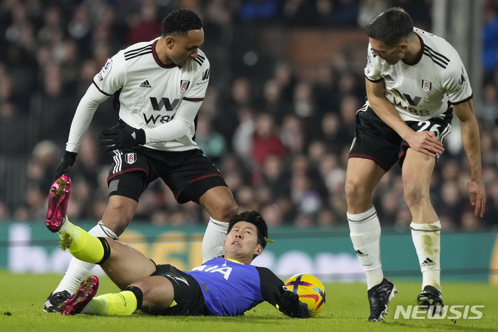[런던=AP/뉴시스] 토트넘 홋스퍼의 손흥민이 23일(현지시간) 영국 런던의 크레이븐 코티지에서 열린 2022-23시즌 잉글랜드 프리미어리그 21라운드 풀럼과 경기하고 있다. 손흥민은 전반 추가시간 해리 케인의 득점을 도우며 팀의 1-0 승리에 이바지했다. 손흥민은 리그 3번째 도움을 기록했고 해리 케인은 토트넘 통산 266번째 골을 기록했다. 2023.01.24.