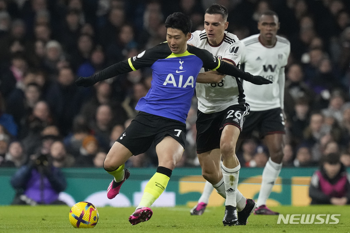 [런던=AP/뉴시스] 토트넘 홋스퍼의 손흥민이 23일(현지시간) 영국 런던의 크레이븐 코티지에서 열린 2022-23시즌 잉글랜드 프리미어리그 21라운드 풀럼과 경기 중 공을 다투고 있다. 손흥민은 전반 추가시간 해리 케인의 득점을 도우며 팀의 1-0 승리에 이바지했다. 손흥민은 리그 3번째 도움을 기록했고 해리 케인은 토트넘 통산 266번째 골을 기록했다. 2023.01.24.