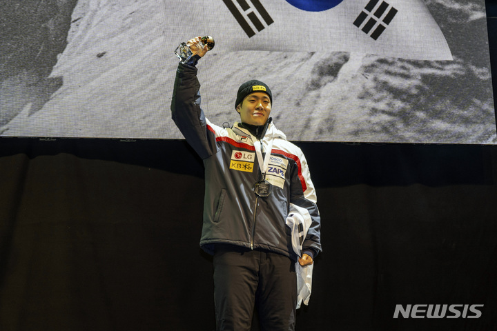 [생모리츠=AP/뉴시스] 정승기가 27일(현지시간) 스위스 생모리츠에서 열린 2022-2023 국제봅슬레이스켈레톤경기연맹(IBSF) 세계선수권대회 남자 스켈레톤 3위를 기록, 시상대에 올라 동메달을 목에 걸고 포즈를 취하고 있다. 정승기는 1∼4차 시기 합계 4분31초17로 3위를 차지했다. 2023.01.28.