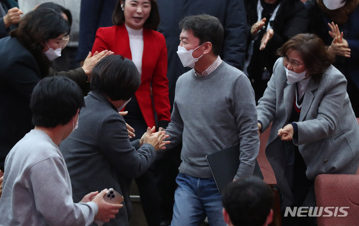 [양주=뉴시스] 추상철 기자 = 국민의힘 당권주자인 안철수 의원이 29일 오후 경기 양주시 경기섬유종합지원센터에서 열린 '수도권 청년들의 미래를 위한 토크콘서트'에서 참석자와 인사하고 있다. 2023.01.29. [email protected]