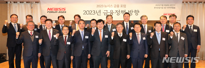[서울=뉴시스] 김금보 기자 = 김형기 뉴시스 대표이사 사장, 윤창현 국회 정무위원회 위원 등 참석자들이 31일 오전 서울 소공동 롯데호텔서울에서 열린 '2023 뉴시스 금융 포럼'에서 기념촬영 하고 있다. 사진 앞줄 왼쪽부터 강호병 뉴시스 부사장, 오화경 저축은행중앙회장, 정지원 손해보험협회장, 함용일 금융감독원 부원장, 윤창현 국회 정무위원회 위원, 김형기 뉴시스 대표이사 사장, 김광수 은행연합회장, 정희수 생명보험협회장, 김철웅 금융보안원 원장, 뒷줄 왼쪽부터 문동권 신한카드 사장, 김성태 IBK기업은행장, 이승열 하나은행장, 이석용 NH농협은행장, 이재근 KB국민은행장, 이원덕 우리은행장, 정완규 여신금융협회장, 유재훈 예금보험공사 사장, 허창언 보험개발원장, 김교태 삼정KPMG 회장, 이재연 서민금융진흥원장 겸 신용회복위원장, 임채율 온라인투자연계금융협회 협회장. 2023.01.31. [email protected]
