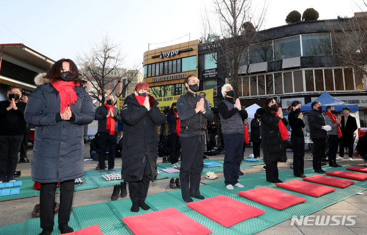 [서울=뉴시스] 조성봉 기자 = 31일 오전 서울 용산구 녹사평역 인근에 마련된 이태원참사 희생자 합동분향소에서 이종철(왼쪽 네번째) 이태원참사 유가족협의회 대표를 비롯한 유가족들이 희생자들의 평안한 안식을 기원하는 159배를 하고 있다.