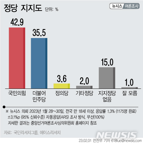 [서울=뉴시스] 뉴시스가 국민리서치그룹·에이스리서치에 의뢰해 1월 28일~30일 지지 정당을 조사한 결과 전체 응답자의 42.9%가 국민의힘을 지지한다고 답했다. (그래픽=전진우 기자)
