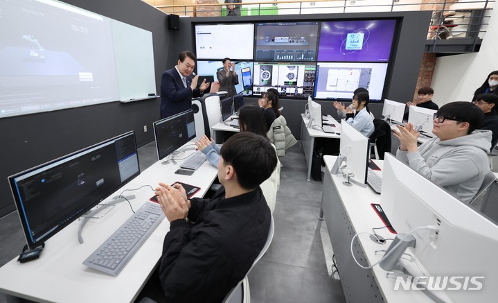 [구미=뉴시스] 홍효식 기자 = 윤석열 대통령이 1일 경북 구미 금오공과대학교에서 열린 제1차 인재양성전략회의에 앞서 재학생·재직자 직무훈련을 참관, 인사말을 한 뒤 박수받고 있다. (대통령실통신사진기자단) 2023.02.01. [email protected]
