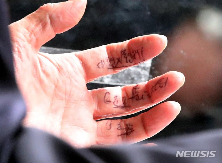 [서울=뉴시스] 고범준 기자 = 2일 오전 서울 여의도 국민의힘 당사에서 안철수 당대표 후보가 후보자 등록을 마친 뒤 손가락에 적힌 메모를 보며 기자들에게 입장을 밝히고 있다. (공동취재사진) 2023.02.02. [email protected]