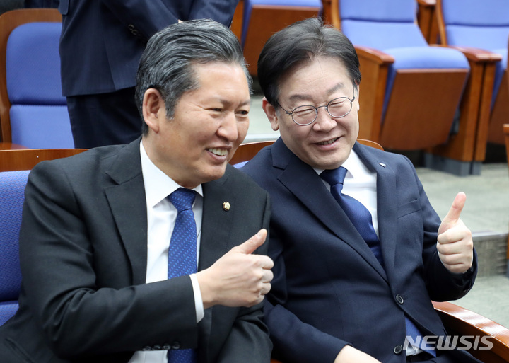 [서울=뉴시스] 이영환 기자 = 이재명 더불어민주당 대표와 정청래 최고위원이 2일 오후 서울 여의도 국회에서 열린 의원총회에서 기념촬영을 하고 있다. 2023.02.02. [email protected]