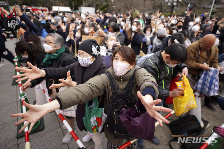 [도쿄=AP/뉴시스] 3일(현지시간) 일본 도쿄 조죠지 사원에서 입춘을 앞두고 연례 '마메마키' 행사가 열려 사람들이 유명 인사들이 뿌리는 '행운의 콩'을 손을 뻗고 있다. 행운을 불러오고 악을 쫓는다는 '마메마키' 의식은 매년 입춘을 앞두고 열리는 '세쯔분'(節分) 행사로 가정뿐 아니라 신사, 절, 학교, 회사 등지에서 열린다. 2023.02.03.