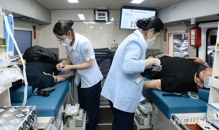 [울산=뉴시스] 배병수 기자 = 3일 오전 울산시청 광장에서 열린 '사랑의 헌혈 봉사의 날'행사에 참가한 시청 직원들이 헌혈을 하며 나눔봉사를 실천하고 있다. 2023.02.03. [email protected].