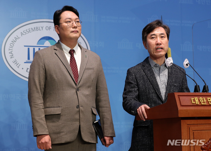 [서울=뉴시스] 이영환 기자 = 국민의힘 하태경 의원이 3일 오전 서울 여의도 국회 소통관에서 당대표 출마 선언 기자회견을 앞둔 국민의힘 전남 순천갑 당협위원장인 천하람 변호사를 소개하고 있다. 2023.02.03. [email protected]