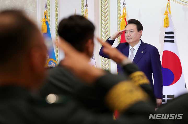 [서울=뉴시스] 홍효식 기자 = 윤석열 대통령이 3일 청와대 영빈관에서 열린 준장 진급 장성 삼정검 수여식에서 진급자들의 거수경례를 받고 있다. 2023.02.03. [email protected]
