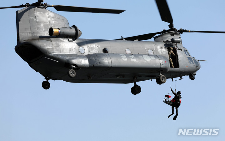 [진천=뉴시스] 김선웅 기자 = 공군 제6탐색구조비행전대 장병들이 3일 충북 진천군 초평저수지에서 혹한기 조종사 수중 조난 상황을 가정해 구조작전 훈련을 진행하고 있다. 공군은 이날 HH-60, HH-47, HH-32 헬기를 이용해 탐색구조훈련을 실시했다. (공동취재사진) 2023.02.04. [email protected]