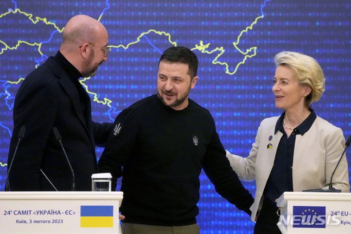 [키이우=AP/뉴시스] 볼로디미르 젤렌스키(가운데) 우크라이나 대통령이 3일(현지시간) 키이우에서 우르줄라 폰 데어 라이엔(오른쪽) EU 집행위원장(오른쪽), 샤를 미셸 EU 정상회의 상임의장과 공동 기자회견을 마치고 얘기를 나누고 있다. 젤렌스키 대통령은 "바흐무트를 내주지 않을 것"이라며 "할 수 있는 한 오래 싸울 것"이라고 밝혔다. 2023.02.04.