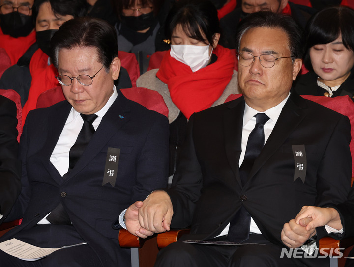 [서울=뉴시스] 고범준 기자 = 이재명 더불어민주당 대표와 정진석 국민의힘 비상대책위원장이 5일 오전 서울 여의도 국회 의원회관 대회의실에서 열린 10.29 이태원 참사 국회추모제에서 기독교 추모의례에 맞춰 손을 잡고 기도하고 있다. (공동취재사진) 2023.02.05. [email protected]
