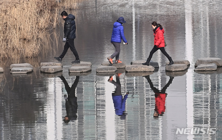 [수원=뉴시스] 김종택 기자 = 5일 오후 경기도 수원시 팔달구 서호천을 찾은 시민들이 포근한 날씨속에 산책하며 징검다리를 건너고 있다. 2023.02.05. [email protected]
