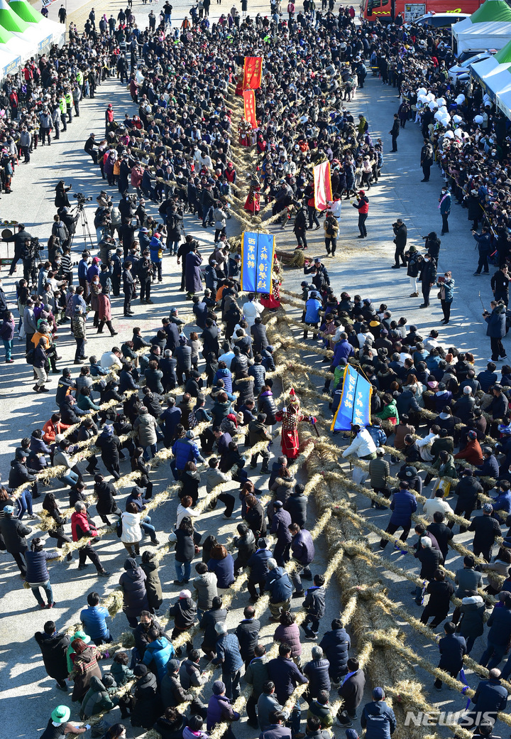 [청도=뉴시스] 이무열 기자 = 정월대보름인 5일 오후 경북 청도군 청도천 둔치에서 열린 2023 정월대보름 민속한마당에 참여한 군민들과 관광객들이 도주 줄다리기를 하고 있다. 이날 열린 정월대보름 행사는 조류인플루엔자(AI)와 코로나19 등으로 인해 5년만에 개최됐다. 2023.02.05. [email protected]