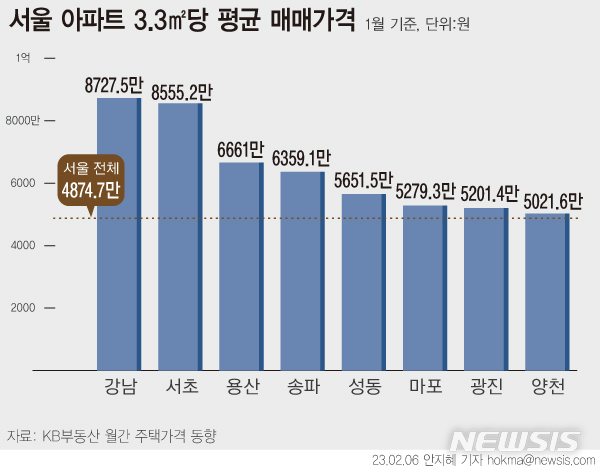 [서울=뉴시스] 서울에서 아파트 3.3㎡(평)당 평균 매매가격이 가장 높은 곳은 강남구와 서초구, 용산구 순으로 나타났다. 1년 전만 해도 서울 아파트 평당가 '톱 3'은 강남 3구(강남·서초·송파)가 차지했지만 송파구 아파트 매매가격이 큰 폭으로 하락하면서 용산구에 3위 자리를 내줬다. (그래픽=안지혜 기자)