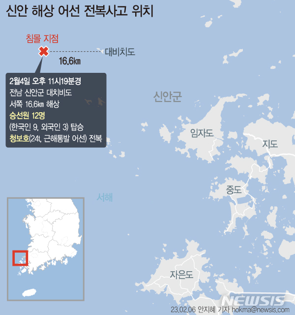 [서울=뉴시스] 6일 목포해양경찰서에 따르면 전남 신안군 해상에서 전복된 선박 '청보호' 선내에서 실종자를 찾기 위해 이날 오전 인양 준비 작업을 본격화한다. (그래픽=안지혜 기자)