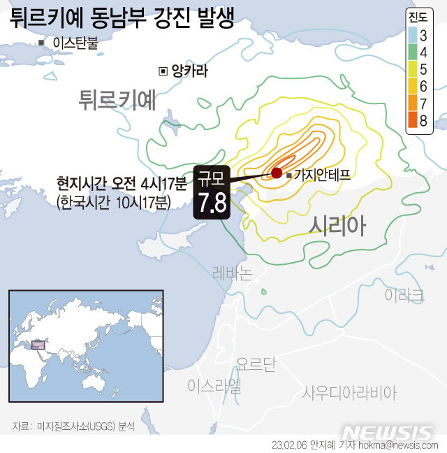 [서울=뉴시스] 6일 미국지질조사국(USGS)에 따르면 오전 4시17분(한국시간 10시17분)께 튀르키예에서 발생한 강진 이후에도 규모 4.0이상의 여진이 최소 20회 이어졌다. (그래픽=안지혜 기자)