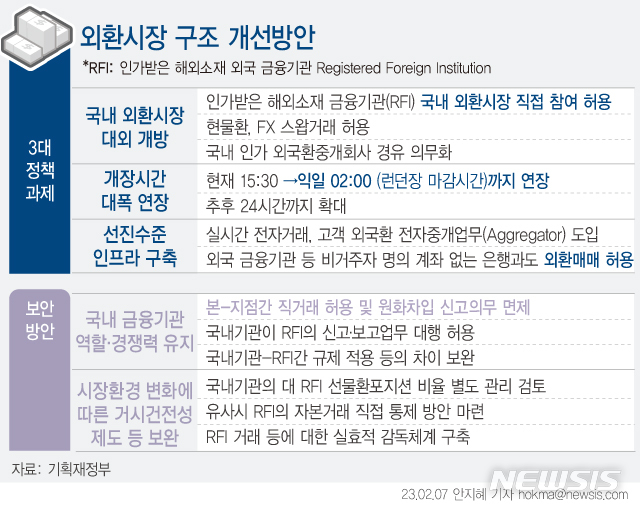 [서울=뉴시스] 정부가 IMF 이후 20년 넘게 폐쇄적으로 운영한 외환시장을 개선한다. 우선 해외 금융기관의 국내 외환시장 직접 참여를 허용한다. 원화와 달러를 즉시 사고 파는 현물환 시장뿐 아니라 빌리고 빌려주는 스와프시장 참여도 허용한다. 해외거래 편의성을 높이기 위해 외환시장 개장시간은 새벽 2시까지 연장한다. (그래픽=안지혜 기자)