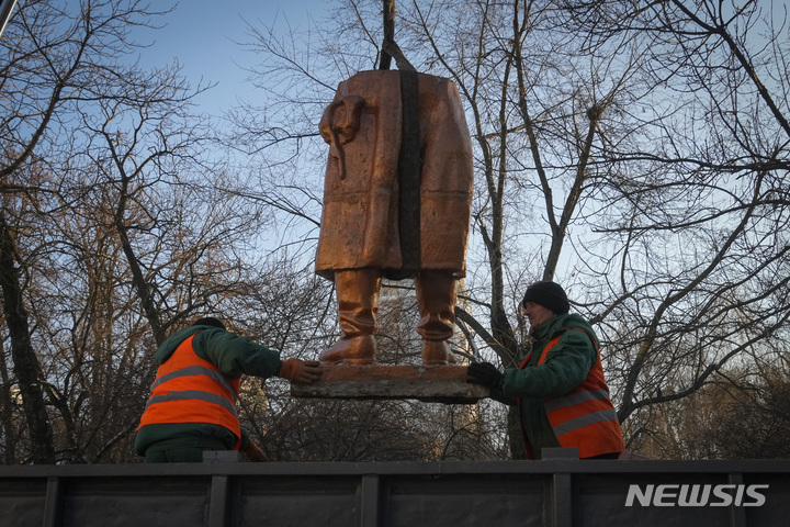 [키이우=AP/뉴시스] 8일(현지시간) 우크라이나 키이우에서 시 근로자들이 구소련 조종사 발레리 치칼로프의 동상을 철거하고 있다. 우크라이나는 구소련과 러시아의 흔적을 지우는 작업을 가속화해 공공장소에 설치됐던 기념비 등을 철거하고 수백 개의 거리 이름을 자국 출신의 예술가, 군인, 지도자 등의 이름으로 바꾸고 있다. 2023.02.09.