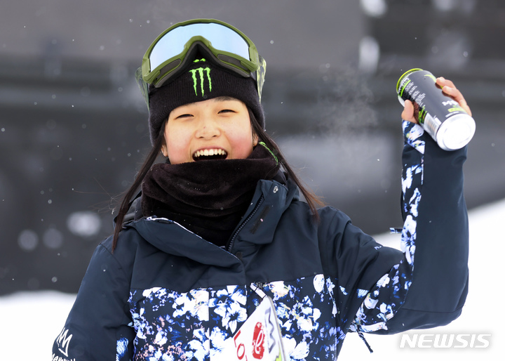 [애스펀=AP/뉴시스] 최가온(15)이 지난달 28일(현지시간) 미 콜로라도주 애스펀의 버터밀크 스키리조트에서 열린 2023 X게임 여자 스노보드 하프파이프 정상에 올라 시상대에서 활짝 웃고 있다. X게임은 익스트림 스포츠의 올림픽과 같은 대회로 우리나라 선수가 이 대회 우승을 차지한 것은 최가온이 최초다. 2023.02.09.